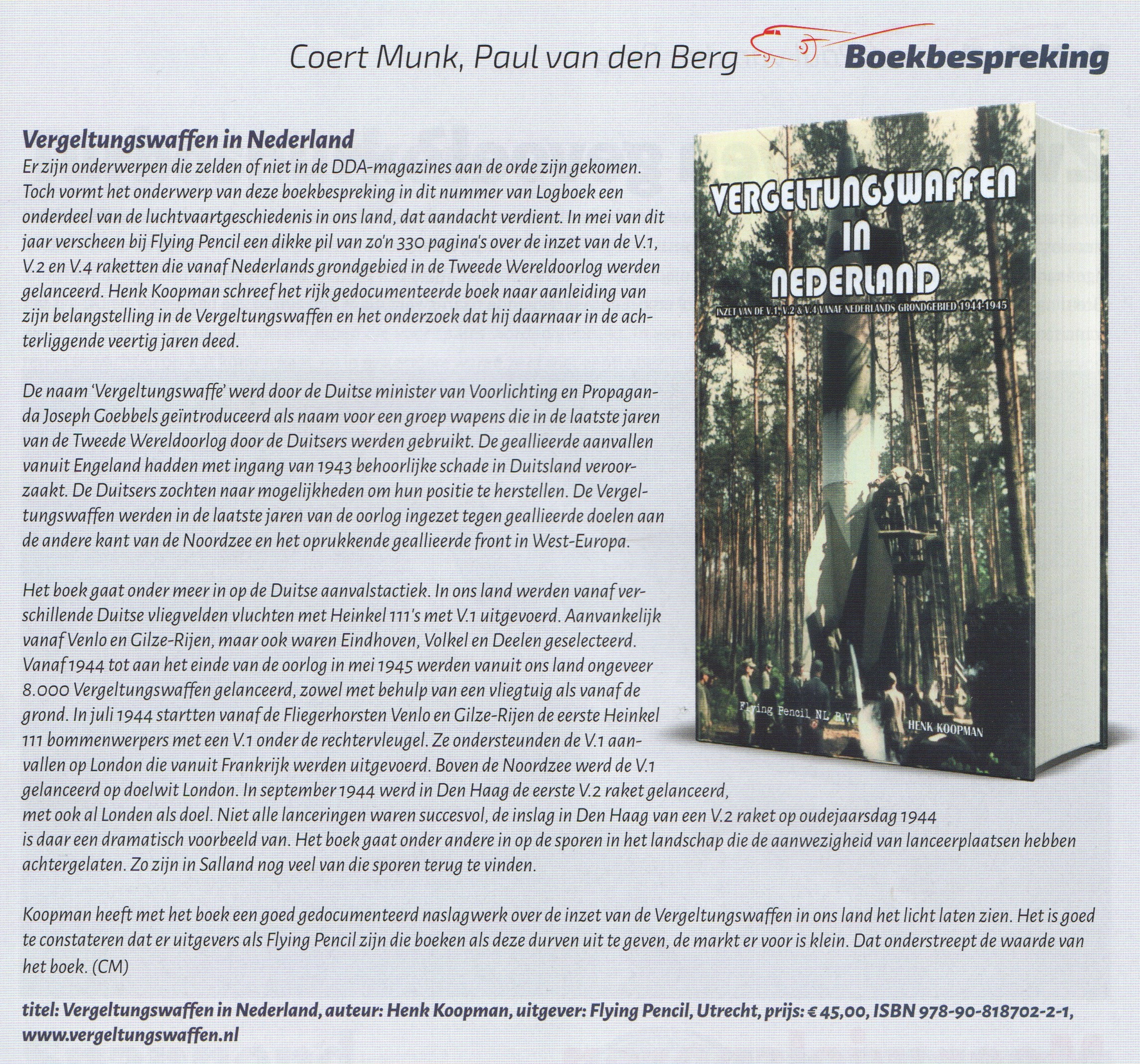 In de augustus 2018 editie van het magazine ‘Logboek, Historische Luchtvaart‘ – een uitgave van ‘DDA Classic Airlines‘ – is een uitgebreide boekbespreking van Vergeltungswaffen in Nederland opgenomen, zie hieronder. Voor meer informatie over het magazine ‘Logboek, Historisch Luchtvaart’: zie https://www.dutchdakota.nl/nl/media/logboek-magazine/