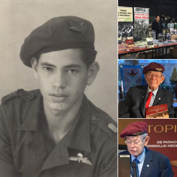 Afbeeldingen (©️Siebe Postma): Links: dhr. Loek Middel in 1948 (ten tijde van de luchtlandingsactie bij Djokjakarta). Rechtsboven: boekenstand Flying Pencil NL B.V. op de Militariabeurs te Houten in december 2022. Rechtsmidden: Dhr. Loek Middel met een exemplaar van het boek Topi Merah. Rechtsonder: Dhr. Loek Middel tijdens zijn voordracht bij de boekpresentatie bij het KCT, november 2022.