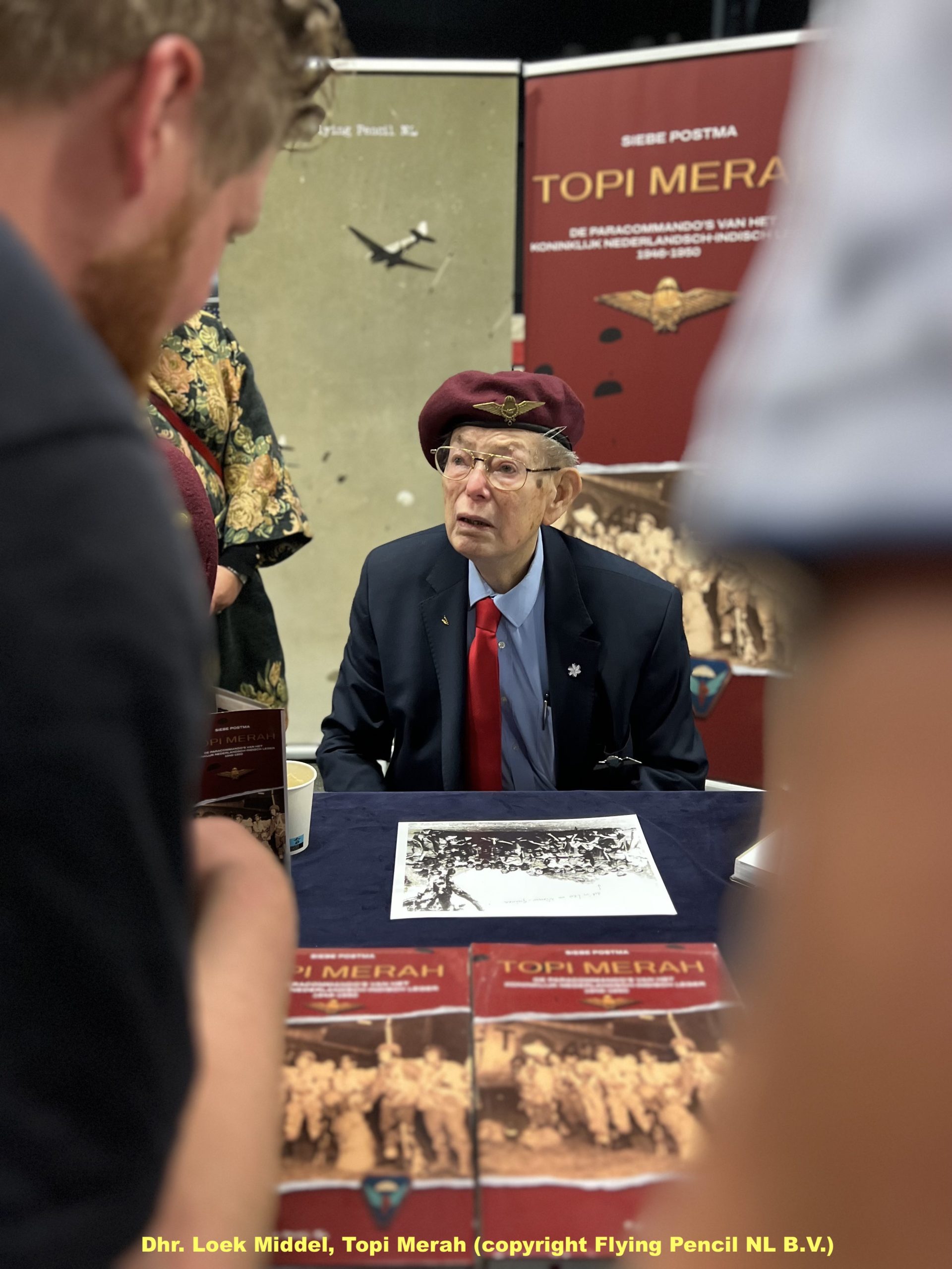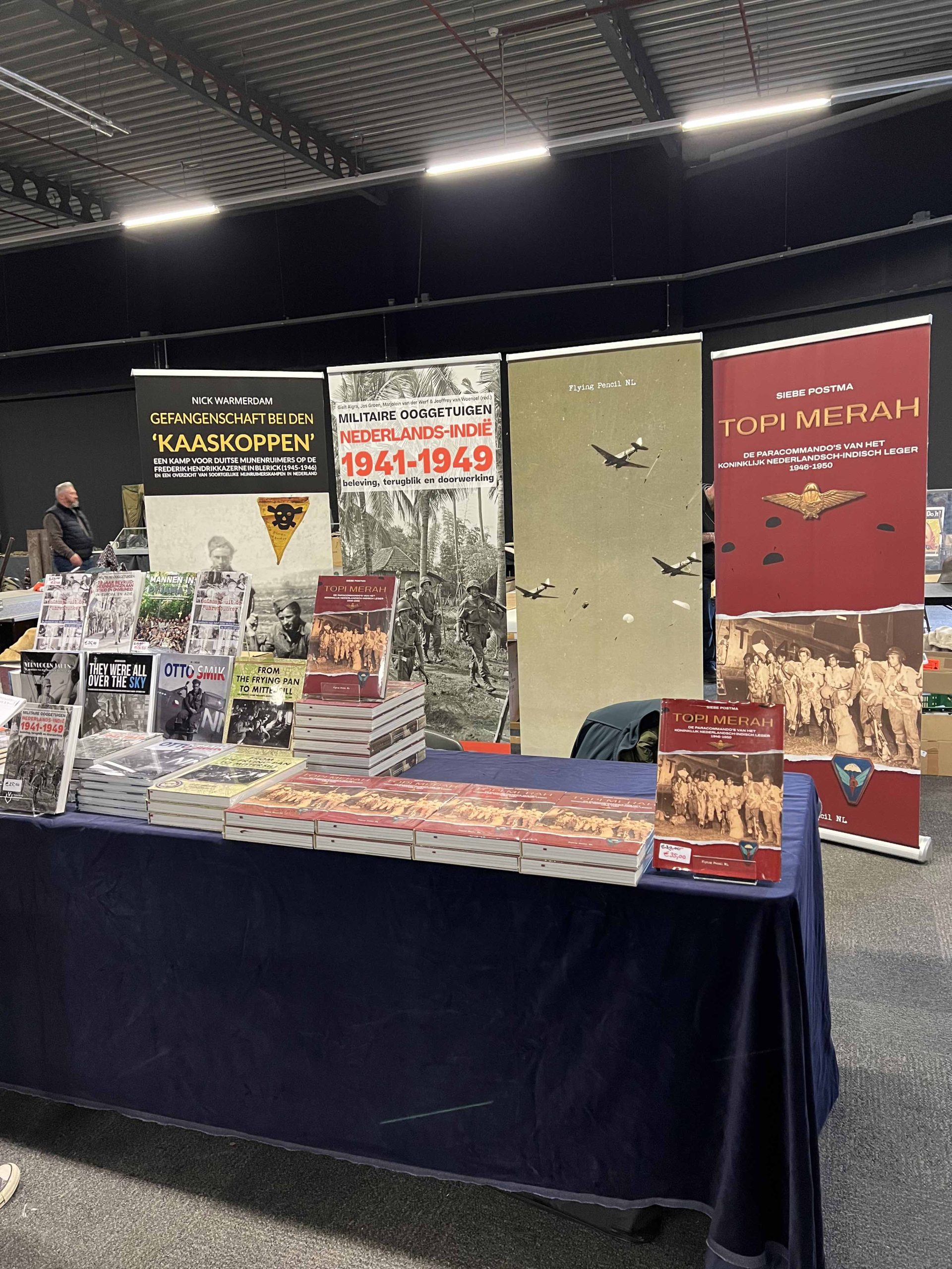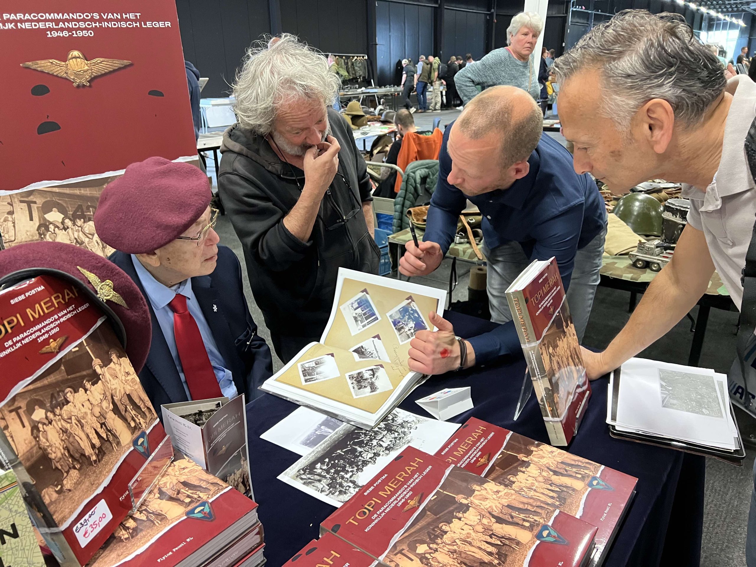 Op 7 mei 2023 stonden wij met een stand vol met boeken op de Militariabeurs te Houten. Aanwezig waren de auteurs Nick Warmerdam van het boek ‘Gefangenschaft bei den Kaaskoppen‘ en Siebe Postma van het boek ‘Topi Merah‘. Beide heren signeerden met veel plezier hun boeken. Bij onze stand was ook dhr. Loek Middel, 98 jaar en oud-Topi Merah aanwezig. Dhr. Middel kon op veel belangstelling onder de bezoekers van de beurs rekenen, signeerde ook en ging graag met een ieder op de foto voor onze ‘Topi Merah’-banner. Ook kwamen talloze kinderen van Topi Merah’s naar onze stand om dhr. Middel te begroeten en te praten over de belevenissen van hun vaders.