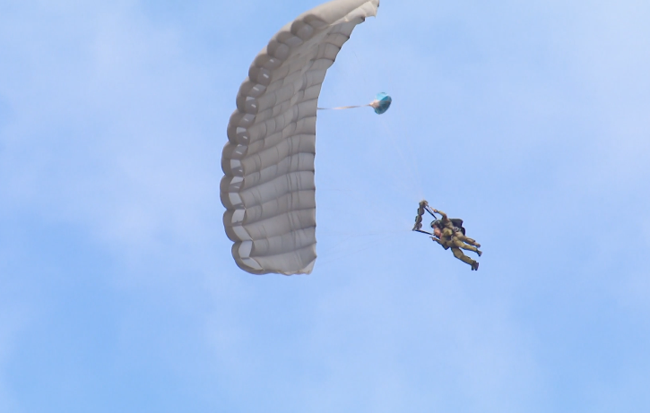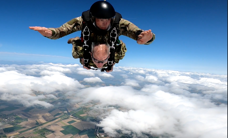 Afbeelding links: langzaam naar beneden glijdend naar de ‘dropzone’. Afbeelding rechts: Mooie en zachte landing. Dhr. Middel vond de sprong ‘sensationeel’! (Copyrights beide afbeeldingen: KCT)