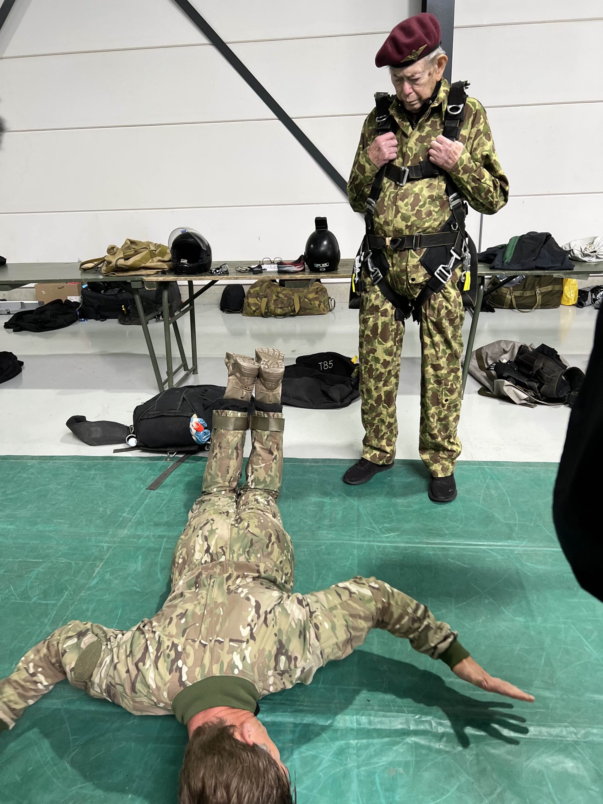 Afbeelding links: Dhr. Middel staat de pers te woord vlak voor de sprong. Op de achtergrond een Cessna 208 ‘Caravan’, het toestel waaruit dhr. Middel zal springen. Afbeelding rechts: Dhr. Middel kijkt en luistert aandachtig naar zijn tandemmaster die instructies geeft. Dhr. Middel heeft een camouflagepak aan die de Paracommando’s van het KNIL destijds ook droegen. (Copyrights beide afbeeldingen: Flying Pencil NL B.V.)
