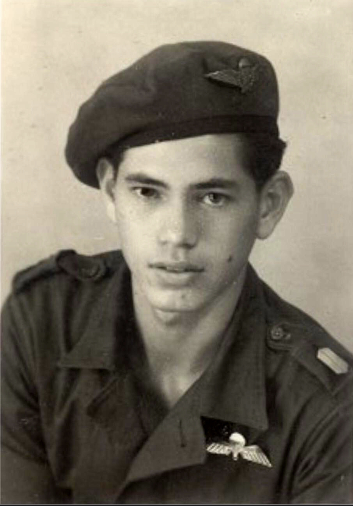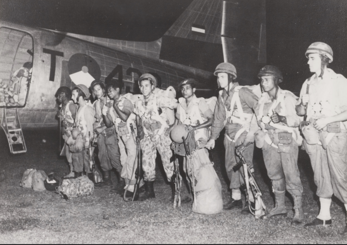 Afbeelding links: dhr. Middel als jonge paracommando van het KNIL in 1948. Afbeelding rechts: de ‘stick’ van dhr. Middel vlak voor de dropping boven Djokja op 19 december 1948. (Copyrights beide afbeeldingen: Siebe Postma)