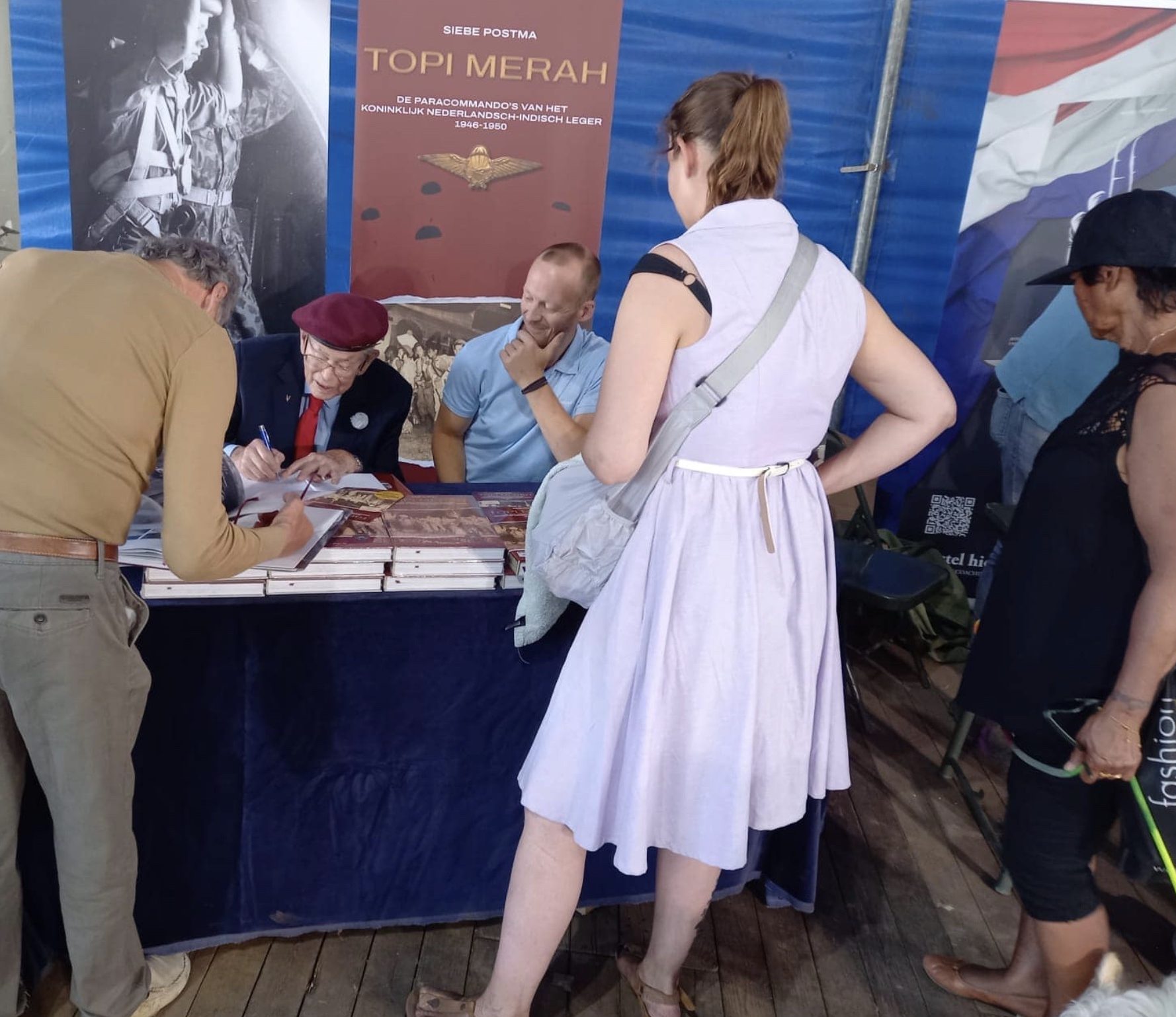 Op 24 juni 2023 vond in Den Haag Veteranendag 2023 plaats. Uiteraard was Flying Pencil aanwezig met een stand in de auteurstent op het Malieveld. Topi Merah-veteraan Loek Middel en auteur Siebe Postma waren ook present om het boek ‘Topi Merah‘ te signeren. Er was veel belangstelling voor het boek als ook voor de ‘meet & greet’ met Loek en Siebe. De Commandant der Strijdkrachten generaal Eichelsheim maakte even tijd vrij in zijn drukke schema voor een ‘meet & greet’ bij onze stand en liet meteen een exemplaar van ‘Topi Merah’ signeren door Loek en Siebe. Het was een fantastische dag waarbij we veel mensen hebben gesproken en interessante verhalen hebben gehoord.